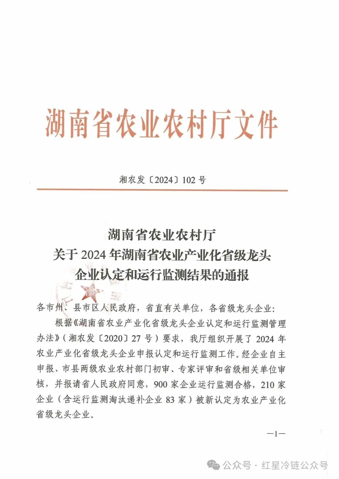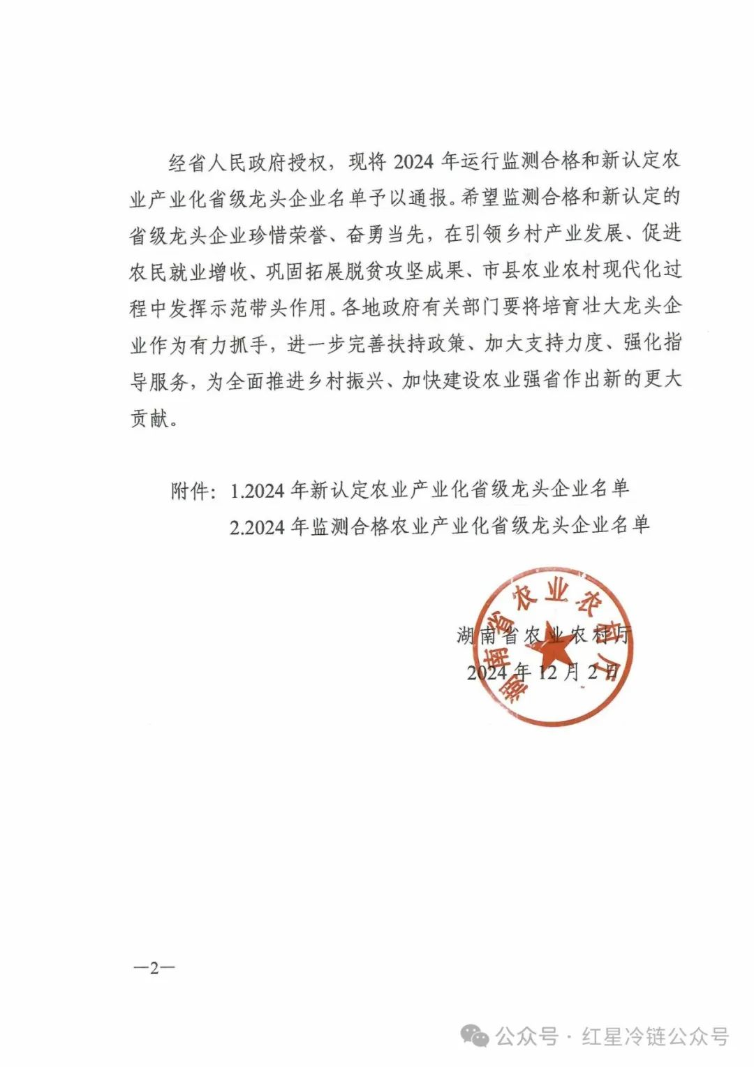 近日,根據(jù)全省統(tǒng)一部署,湖南省農(nóng)業(yè)農(nóng)村廳公布了2024年度省級(jí)“龍頭企業(yè)單位”名單,紅星冷鏈喜獲殊榮。